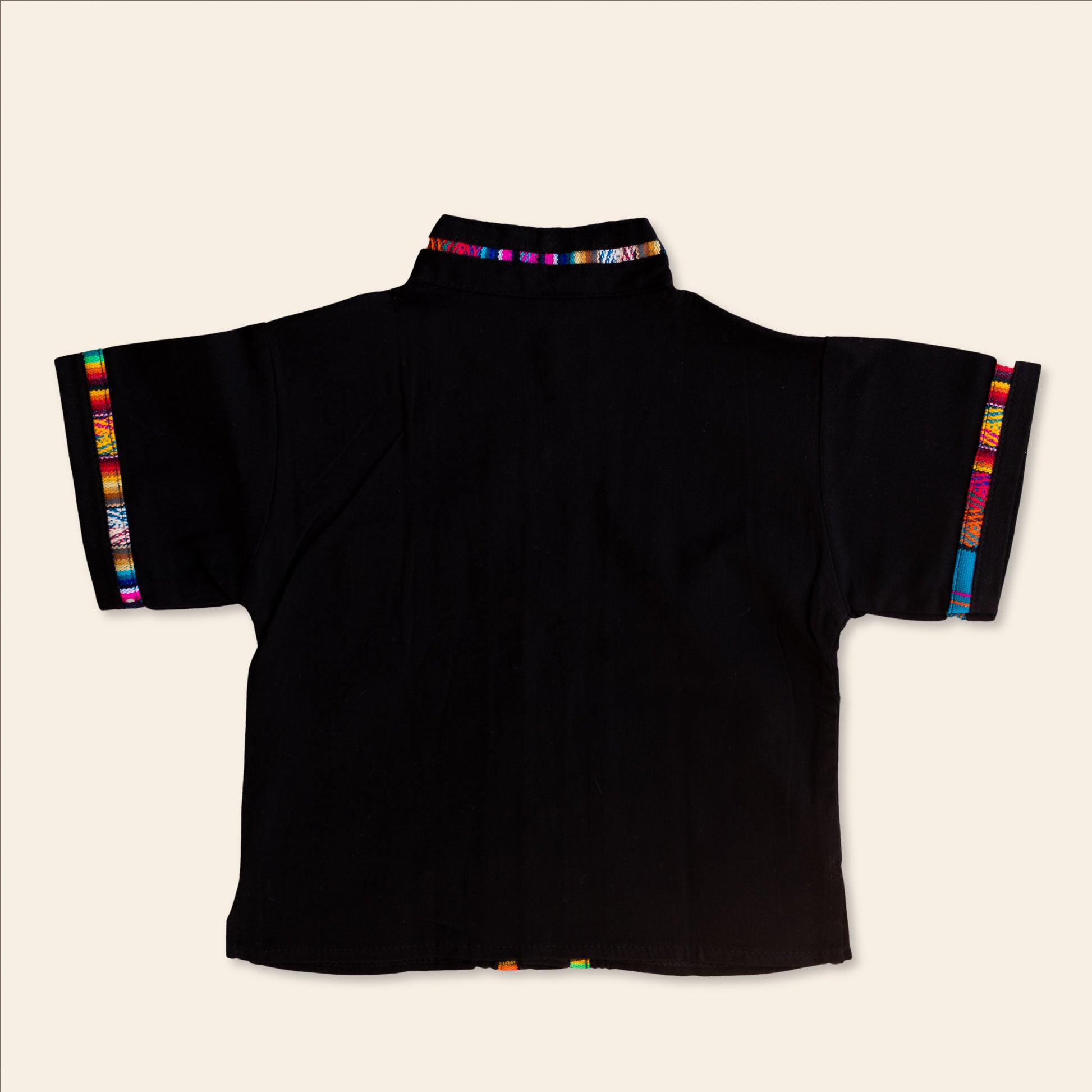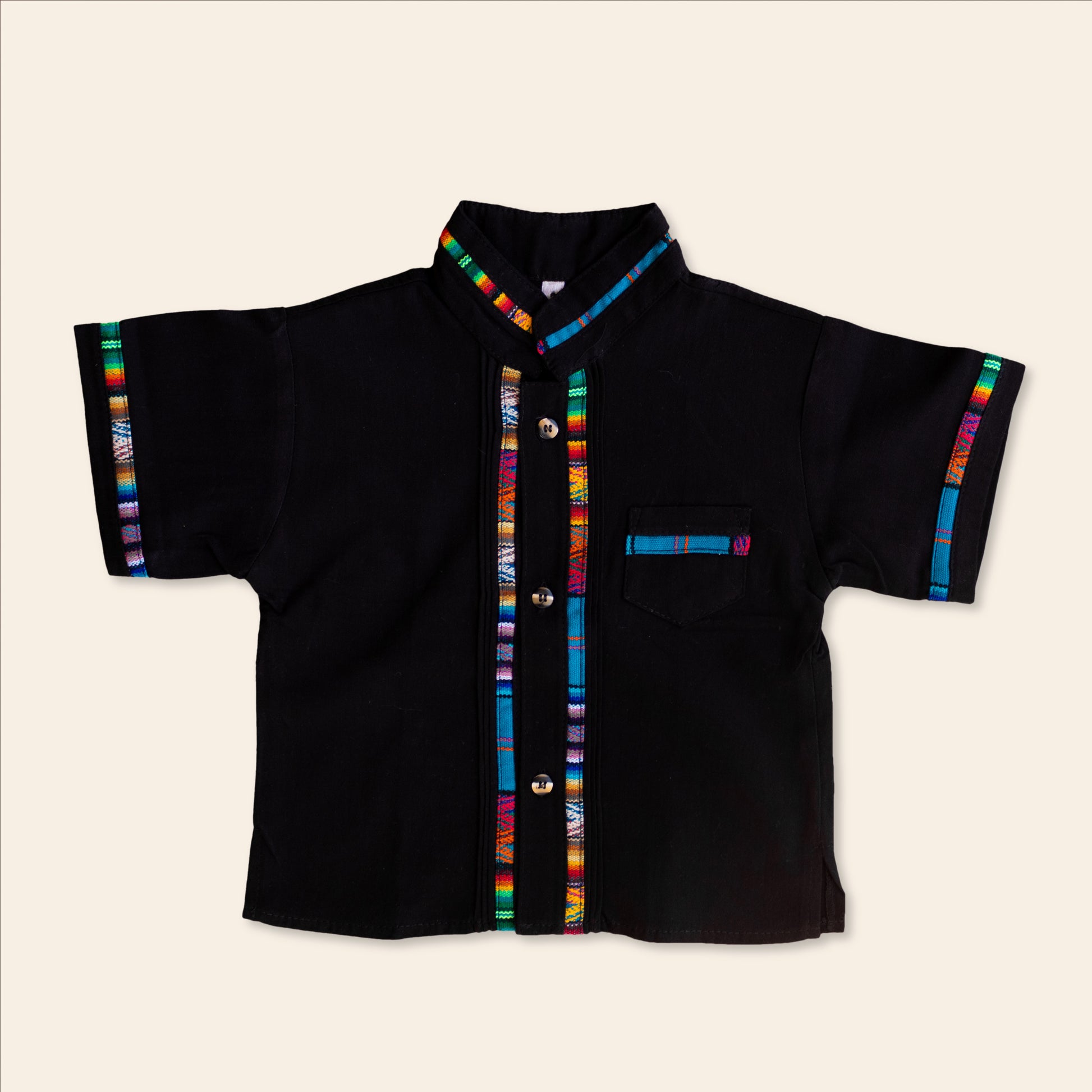 Boys Black Guayabera Manta Shirt handmade in Mexico. This is a casual or formal dress shirt that can be worn with a variety of styles, but most often with jeans or slacks for casual wear. The guayabera features a subtle weave pattern on both sides of the linen cloth, which gives the garment its unique texture and character.